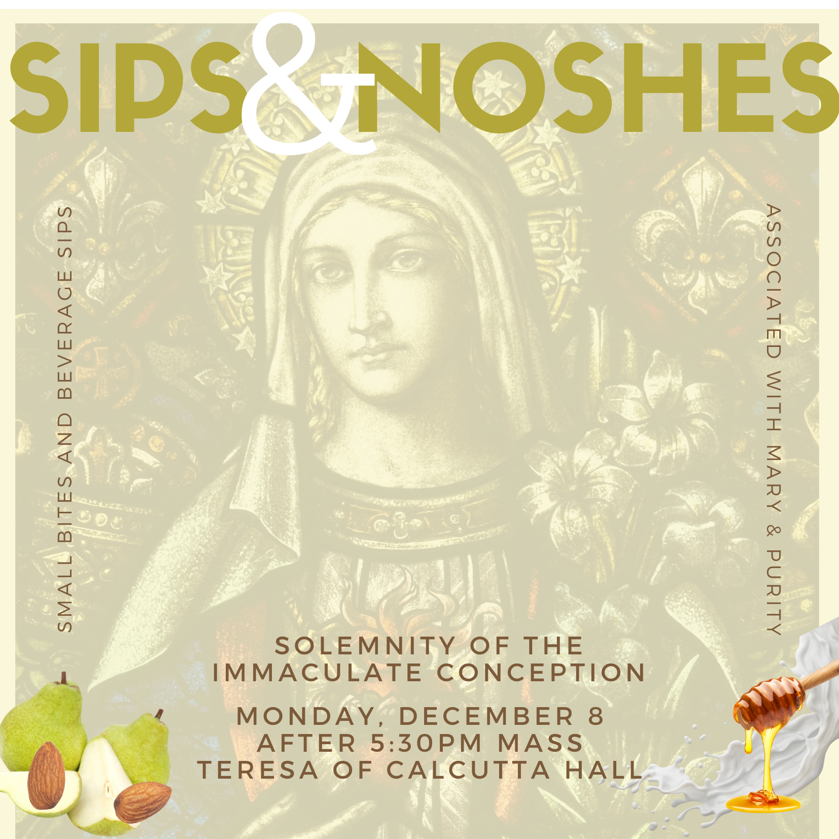 Join us Monday, December 8, on the Solemnity of the Immaculate Conception after 5:30pm Mass for “Sips and Noshes.” Enjoy gourmet small bites and beverage sips featuring ingredients associated with Mary and purity, including pears, almonds, cream and honey. Freewill donations will be accepted at the event.